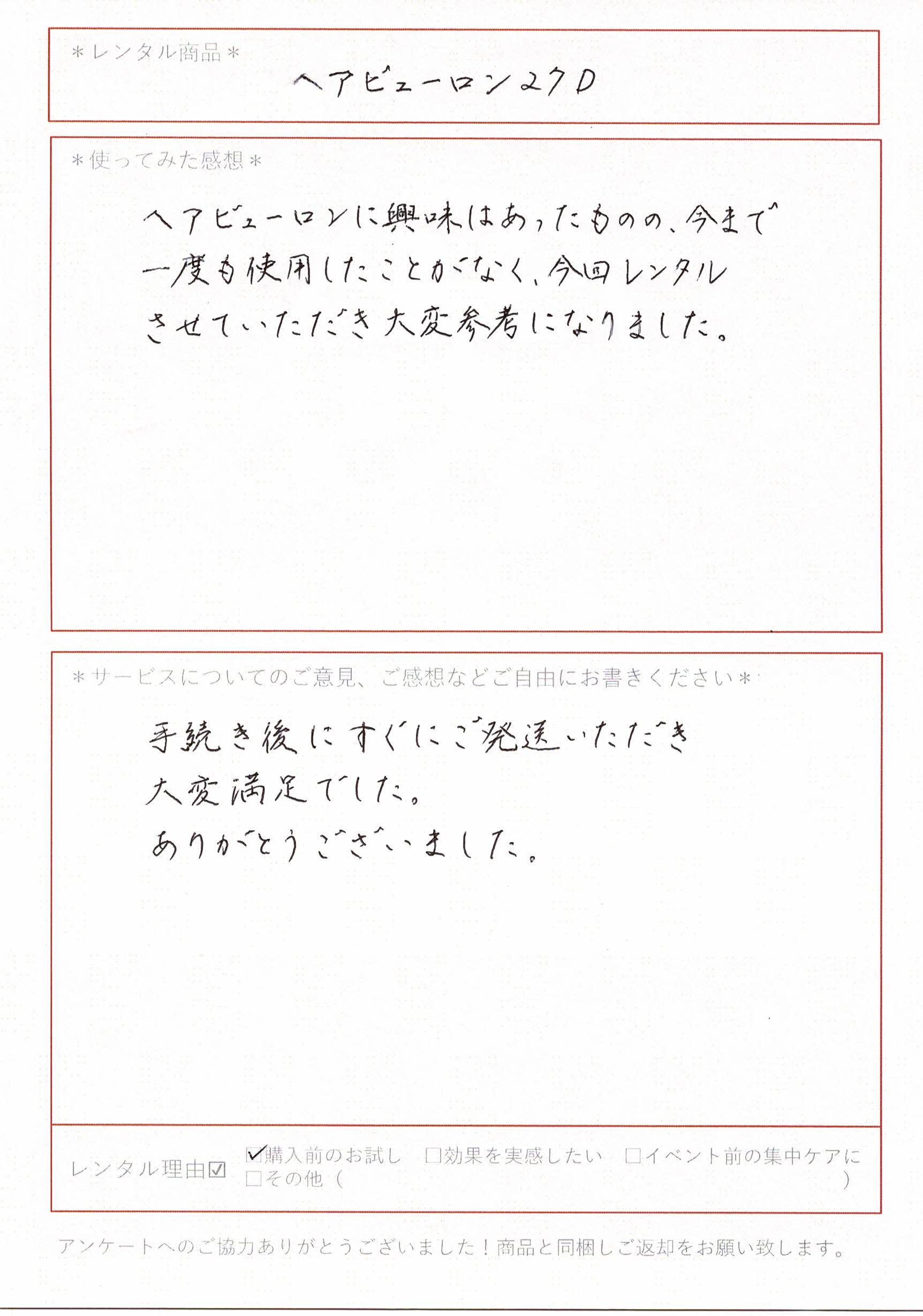 ヘアビューロンに興味はあったものの今まで一度も使用したことがなく、今回レンタルさせていただき大変参考になりました。