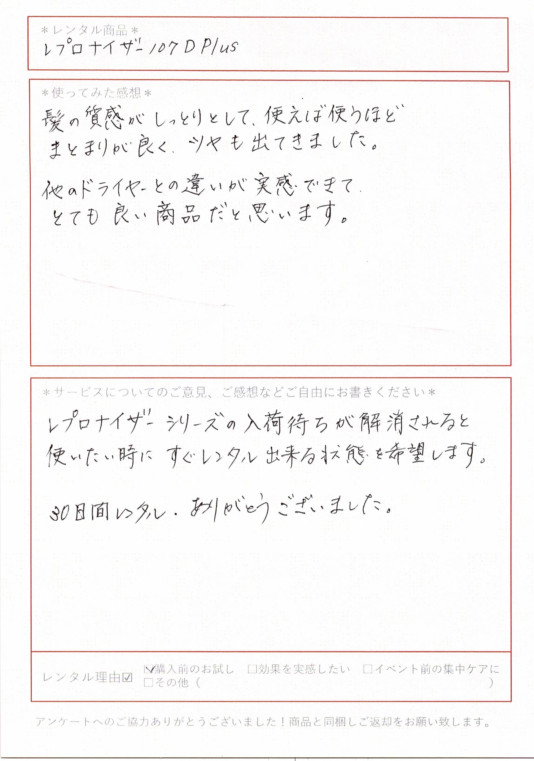 レプロナイザーシリーズの入荷待ちが解消されると使いたい時にすぐレンタル出来る状態を希望します。